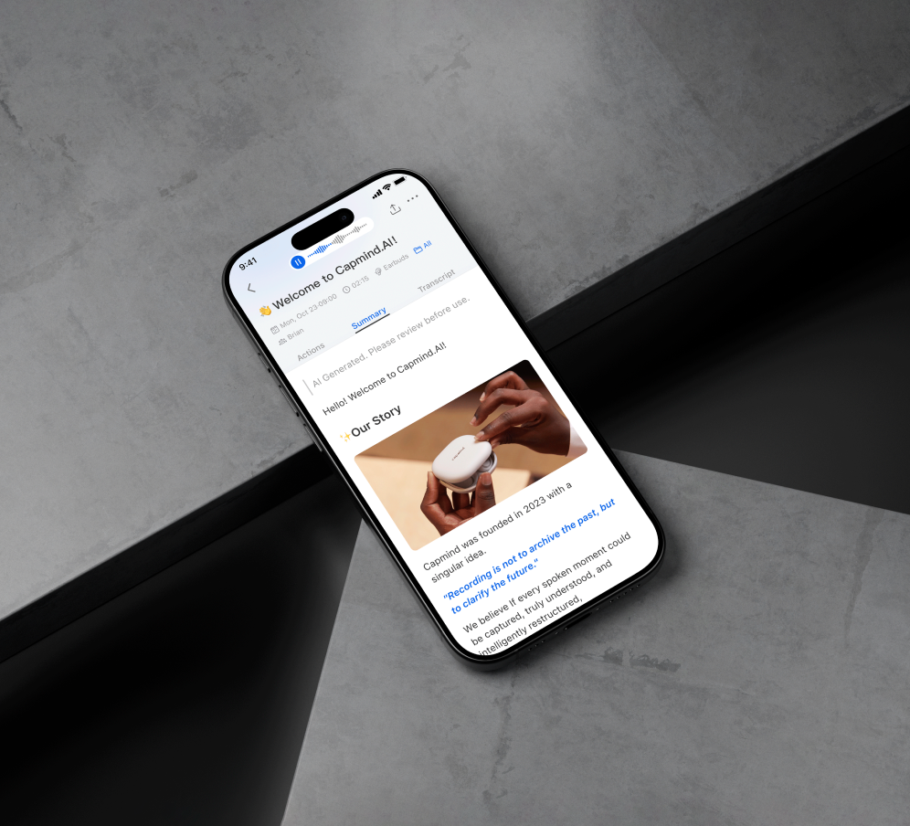 Capmindは音声AIを活用して、会議や対話を自動で記録・要約し、タスク抽出や意思決定支援を行います