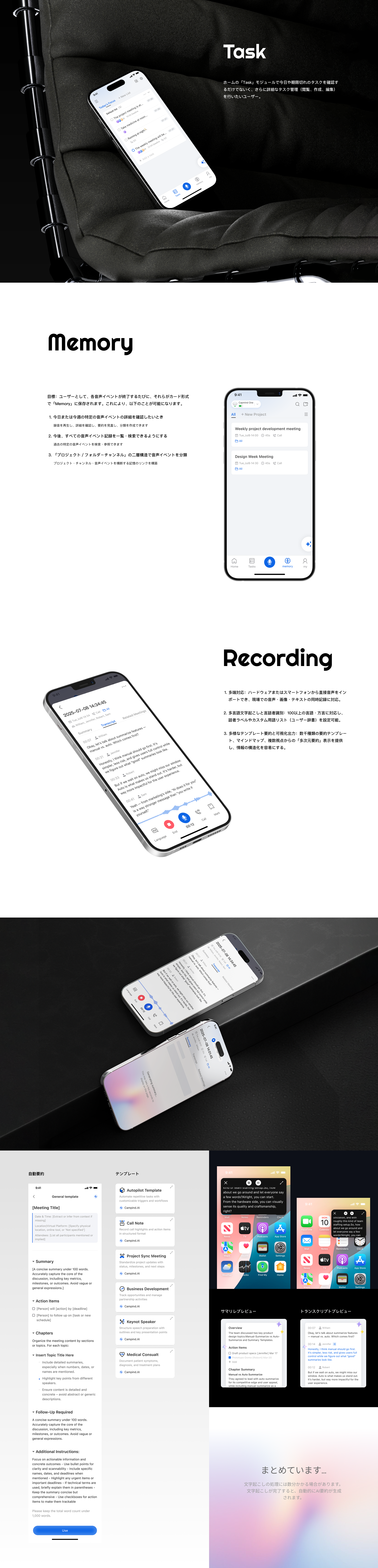 Capmindは音声AIを活用して、会議や対話を自動で記録・要約し、タスク抽出や意思決定支援を行うコミュニケーション効率化アプリです
